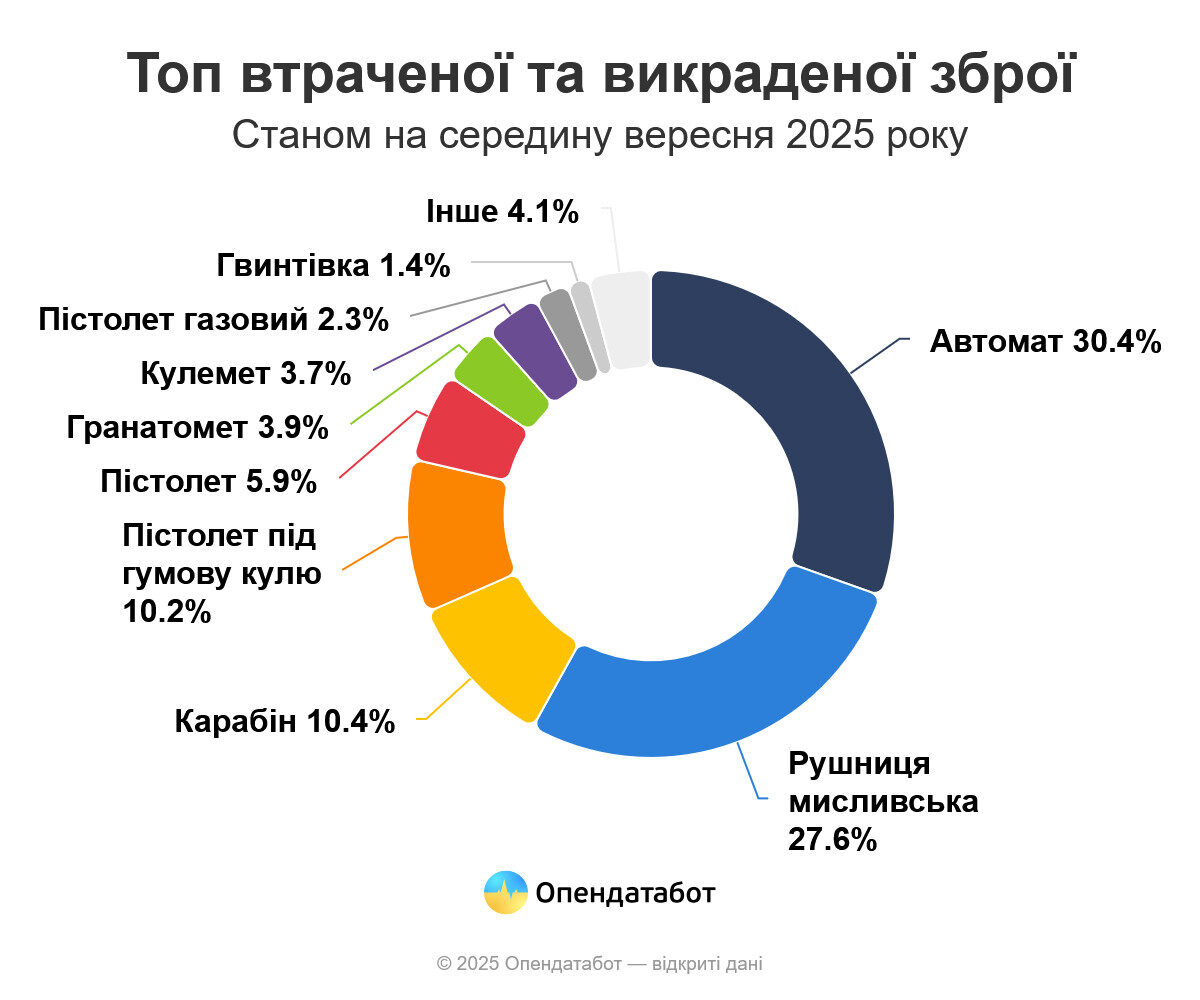Динаміка. Понад 491 тисячу одиниць зброї було втрачено або викрадено в Україні від початку повномасштабної війни. За останній рік кількість втраченої зброї зросла майже удвічі — із 270,9 тисячі у вересні 2024-го до майже півмільйона у вересні 2025 року. У 94% випадків зброю втрачають, тоді як на викрадення припадає 6%.