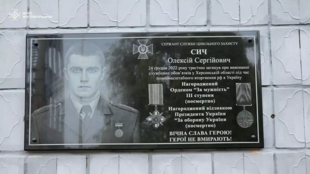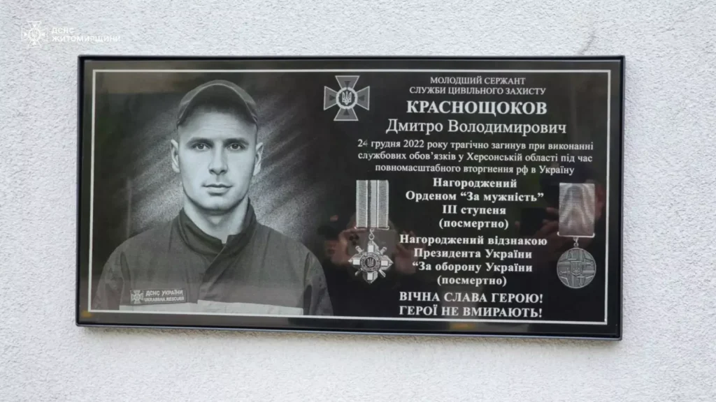 Памʼять про загиблих побратимів завжди житиме в серцях рятувальників Житомирщини. У День захисників і захисниць України вони увіковічнили її в граніті. На будівлях пожежно-рятувальних підрозділів області фахівці ДСНС відкрили 4 пам’ятні дошки на честь своїх колег — Дмитра Краснощокова, Олексія Сича, Сергія Курінного та Володимира Бондарчука. Вони загинули під час виконання свого обов’язку, рятуючи інших.