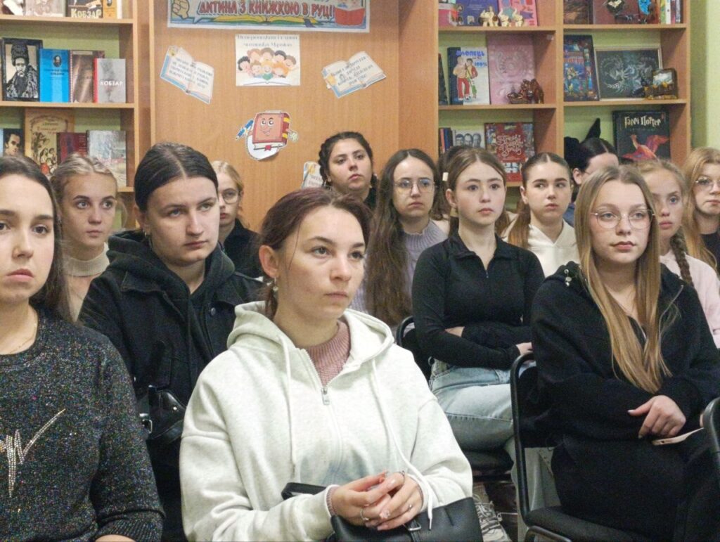 З великою увагою студентки слухали гостю-військову. Вона представила проєкт “Батальйон гідних”. Це відео про захист Гостомеля в перші дні повномасштабного вторгнення ворога на нашу землю. Складається з історій 17 студентів Житомирського військового інституту ім.С. Корольова, які стали на захист України.