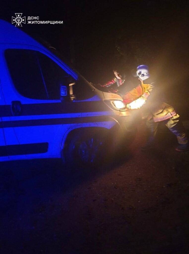 В селищі  Корнин Житомирського району рятувальники допомогли працівникам екстреної медичної допомоги, автомобіль яких застряг на вузькій сільській вулиці. Після приїзду на виклик водій «швидкої» намагався розвернутися, однак спецтранспорт загруз у бездоріжжі.