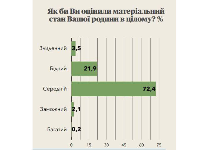 Поширити Facebook Twitter LinkedIn Pinterest Email 22% українців назвали себе бідними, а 3,5% – злиднями, – опитування 72,4% оцінили добробут своєї родини як середній, 2,1% опитаних вважають себе заможними і 0,2% багатими. Телеграм-канал «Що по цифрах?» Коментувати See more Politics гроші Житомир Україна Фінанси