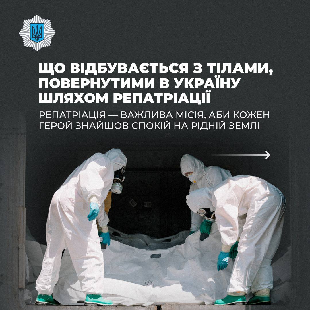 Детальніше про те, що відбувається з тілами після повернення в Україну, як проходить ідентифікація та чому цей процес такий складний (https://mvs.gov.ua/mvs-specprojekti/shho-vidbuvajetsia-z-tilami-povernutimi-v-ukrayinu-sliaxom-repatriaciyi)