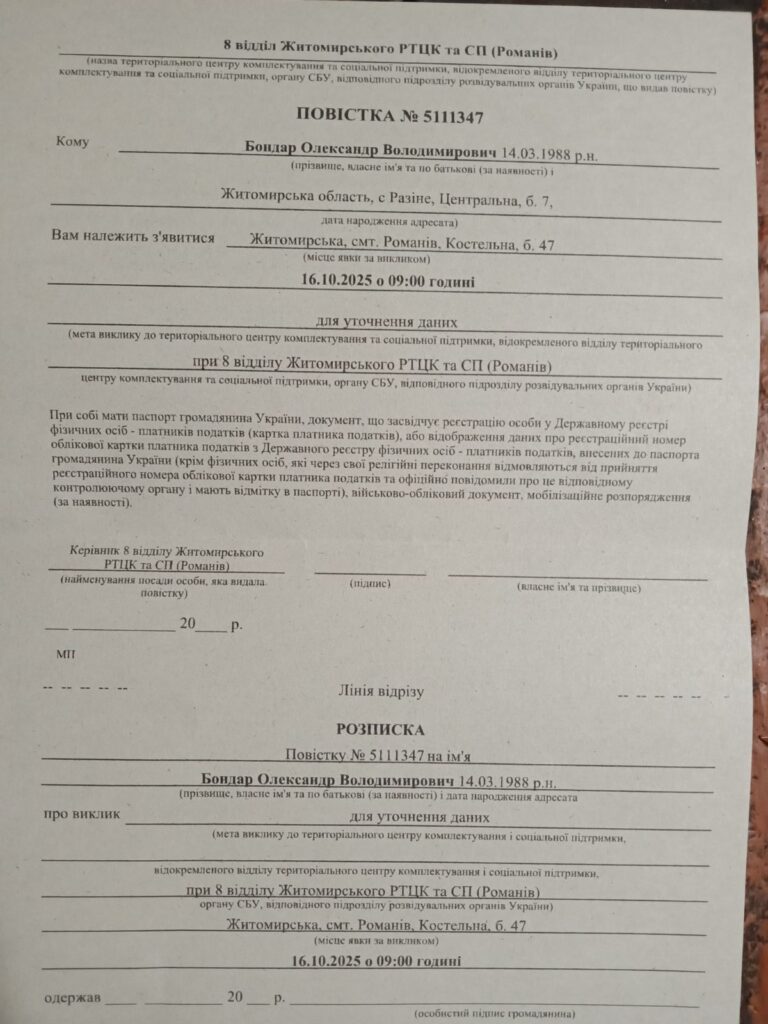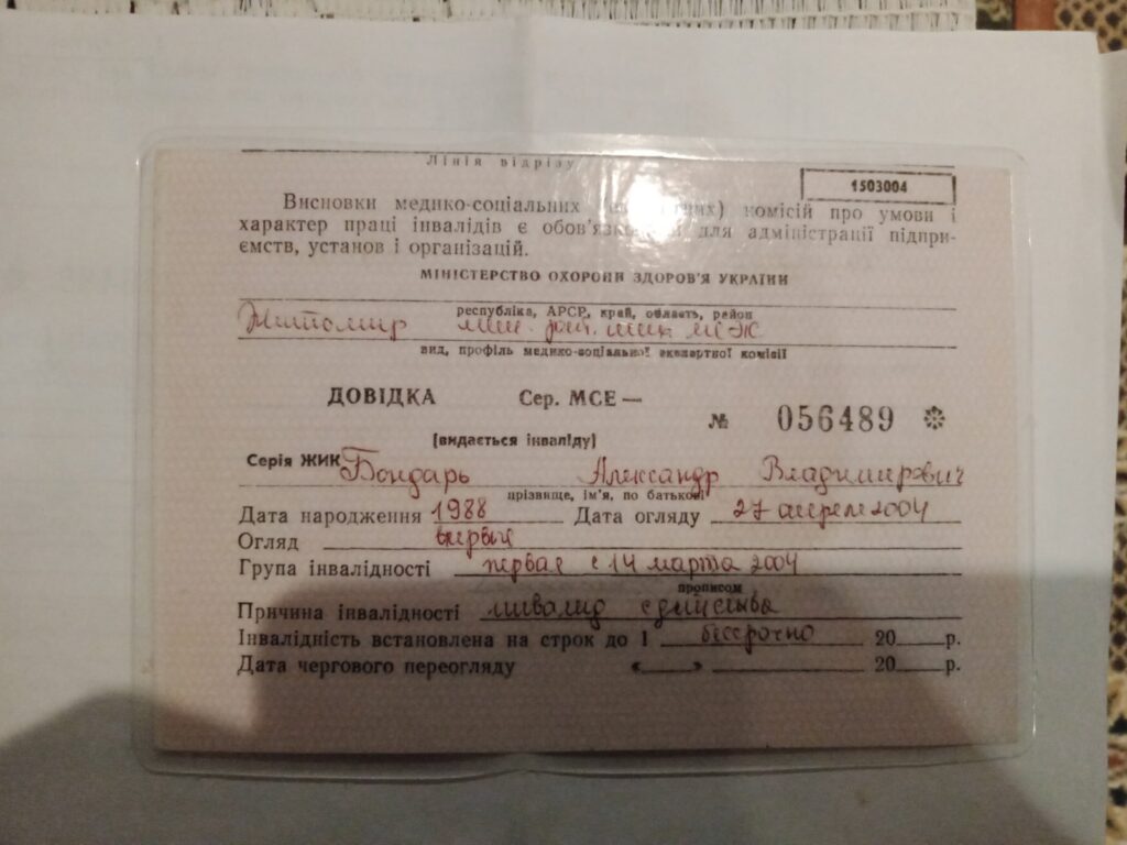 Та яким було здивування батька Володимира Михайловича Бондаря, коли на цьому тижні (15 жовтня) йому староста О. Л. Жовтун приніс повістку від Романівського ТЦК для старшого сина цієї родини – Олександра, 1988 року народження. Але він відповідно до довідки МСЕК (Житомир) під № 056489 є інвалідом першої групи (ДЦП)…