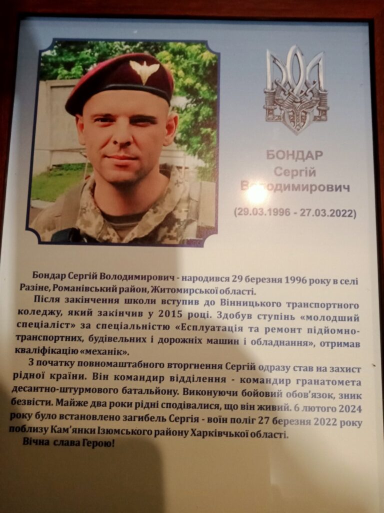 Навіть у страшному сні, здається, не могло таке приснитися, що цими днями пережила родина загиблого Героя Сергія Бондаря із с.Разіно Романівської громади. Молодший сержант Сергій Володимирович Бондар був командиром відділення, командиром гранатомета десантно-штурмової батареї 95-ої ОДШБ, замкомвзвода. Виконуючи бойовий обов’язок, він зник безвісти. Майже два роки рідні сподівалися, що син живий. Лише 6 лютого 2024 року було встановлено, що він поліг на полі бою ще 27 березня 2022 року поблизу Кам’янки Ізюмського району Харківської області. Його подвиг відзначений Орденом «За мужність» ІІІ ступеня (посмертно).