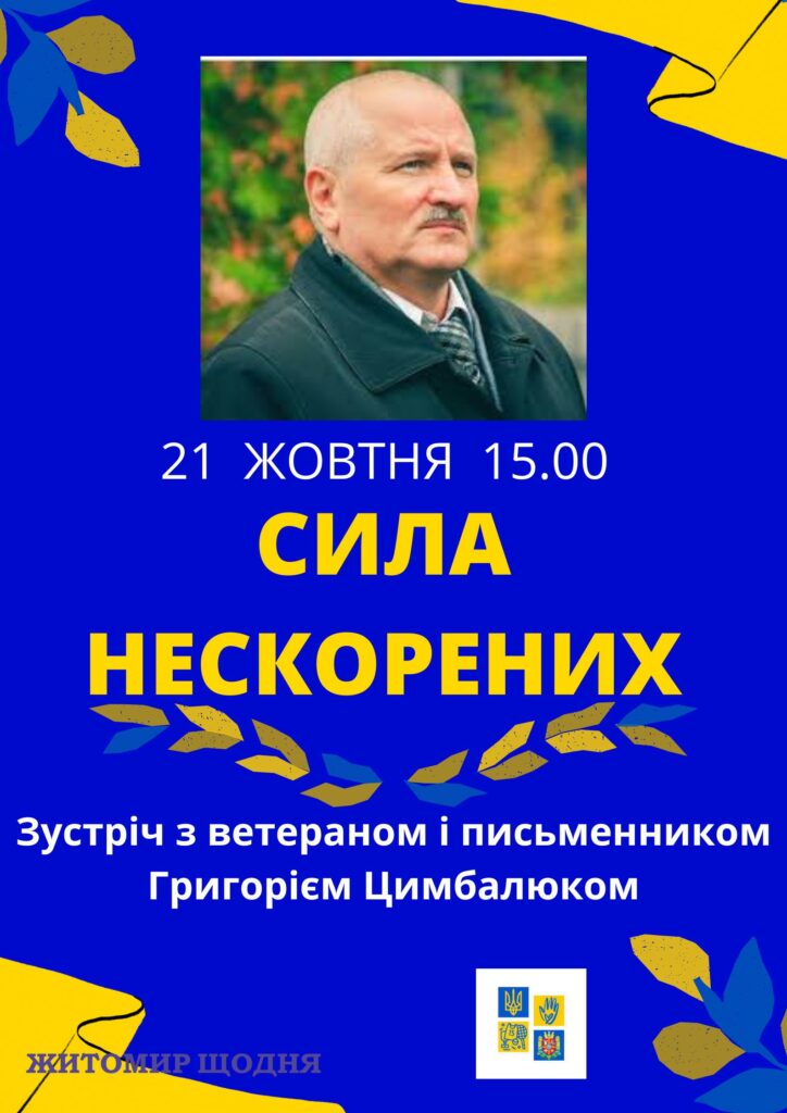 Зустріч «Сила нескорених» 21 жовтня пройде для молоді Житомирщини. Гість заходу Григорій Цимбалюк, ветеран АТО, учасник російсько-української війни. За участь у захисті держави має відзнаки Президента України та Генерального штабу ЗСУ.
