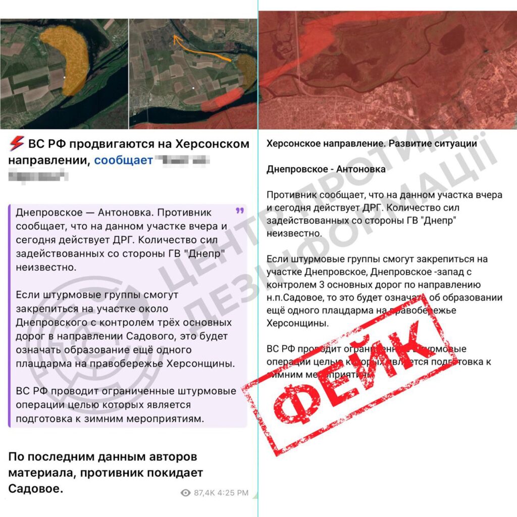 Ворожі Telegram-канали поширюють повідомлення про «висадку» та «прорив» російських ДРГ у напрямку населених пунктів Антонівка та Садове на Херсонщині.