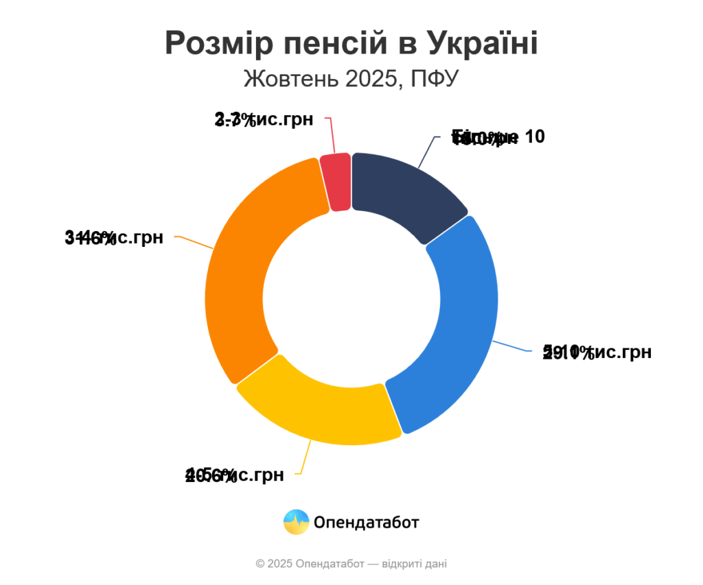 Водночас є й ті, хто отримує більше. Так, близько 1,5 мільйона людей, або 15% усіх пенсіонерів, мають середню виплату 15 750 грн — це приблизно 325 євро. Ще майже 3 мільйони українських пенсіонерів отримують, у середньому 6 860 грн, а 2,1 мільйона — лише 4 510 грн.