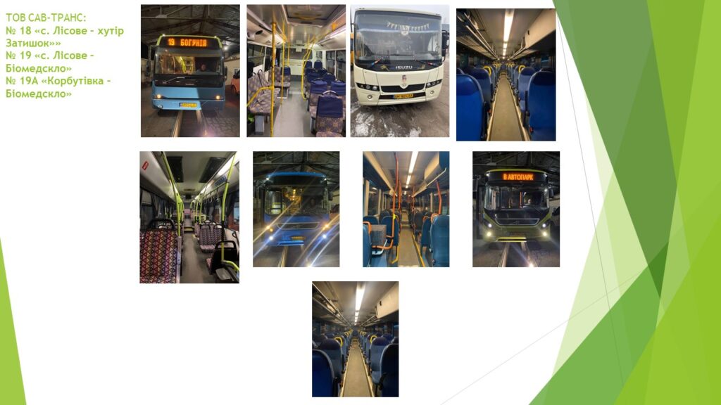 🔹маршрут №18 «с. Лісове – Хутір Затишок»; №19 «с. Лісове –Біомедскло»; №19А «Корбутівка – Біомедскло» — ТОВ “САВ-ТРАНС”.