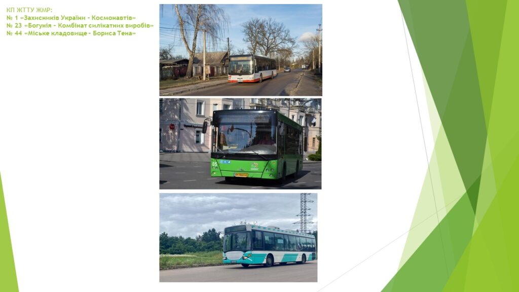🔹маршрут №1 “Захисників України — Космонавтів”; маршрут №23 “Богунія — Комбінат силікатних виробів”; маршрут №44 “Міське кладовище — Бориса Тена” — КП “ЖТТУ” ЖМР.