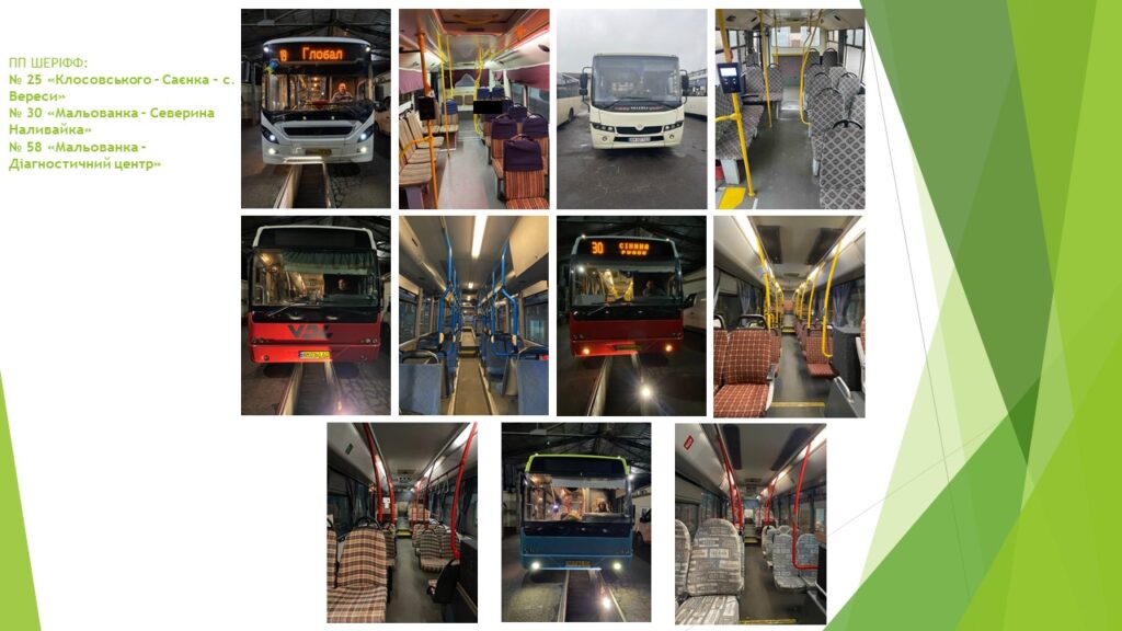 🔹маршрут № 25 “Клосовського — Саєнка — с. Вереси»; №30 «Мальованка — Северина Наливайка»; №58 «Мальованка — Діагностичний центр» — ПП “ШЕРІФФ”.