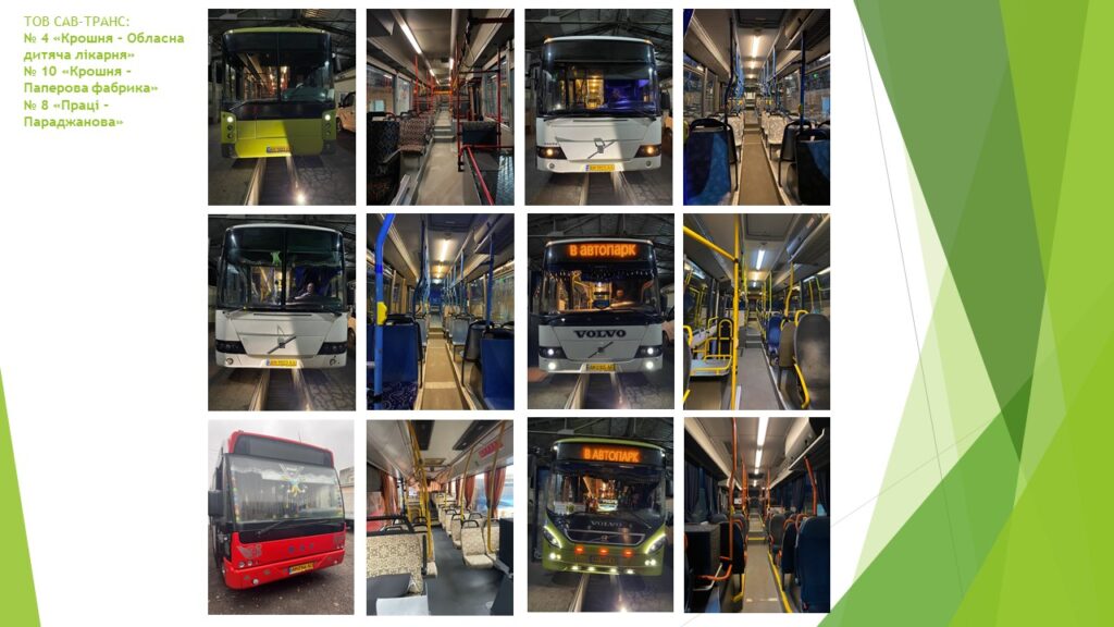 🔹маршрут №4 “Крошня — Обласна дитяча лікарня”; №10 “Крошня — Паперова фабрика”; №8 “Праці — Параджанова”.— ТОВ “САВ-ТРАНС”.