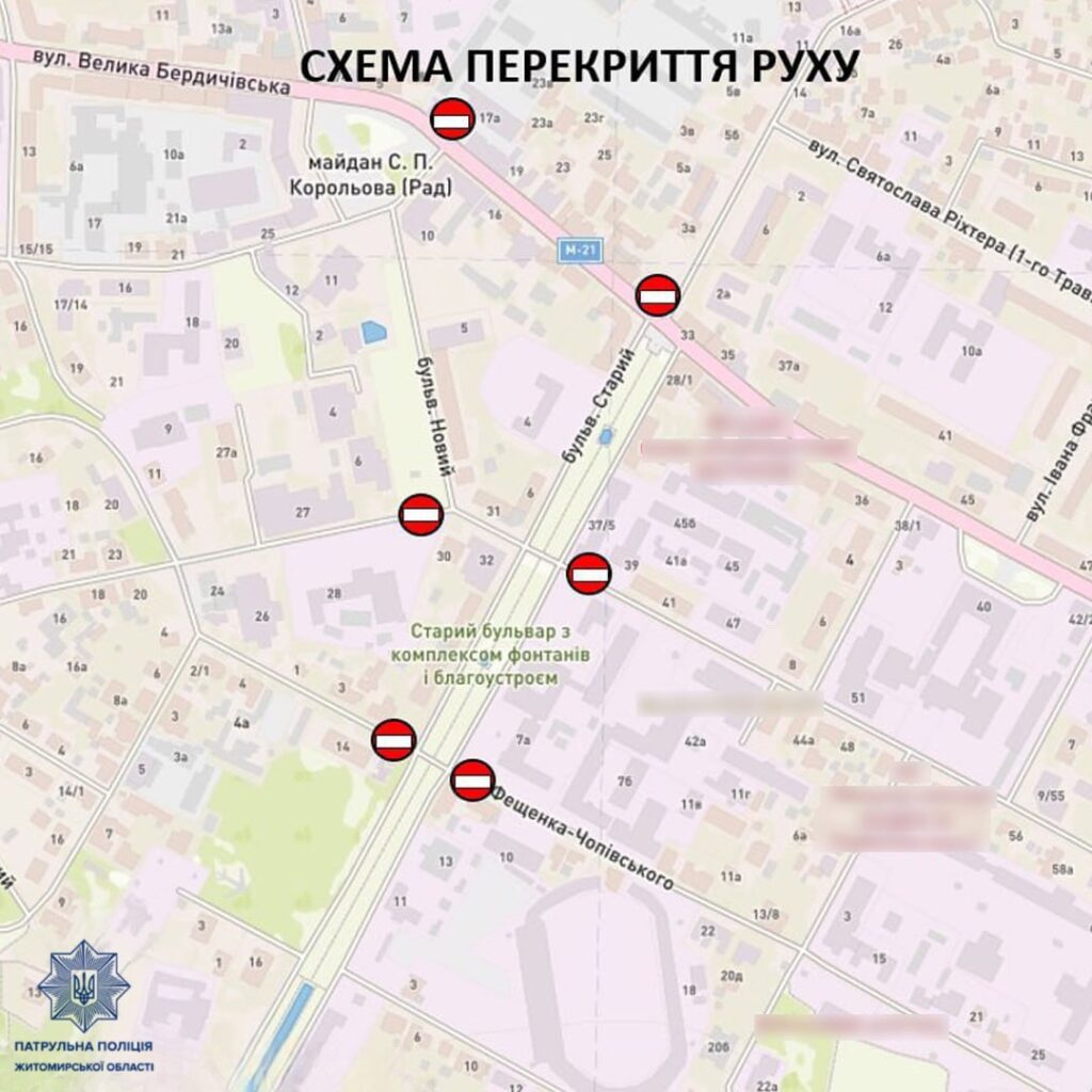 в’їзд на вулицю Мала Бердичівська з вулиці Великої Бердичівської буде перекрито з 5-ї години ранку;