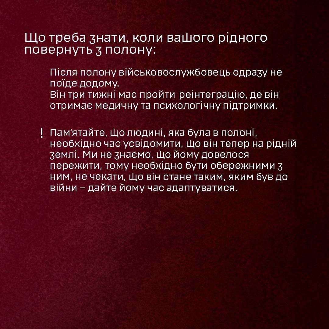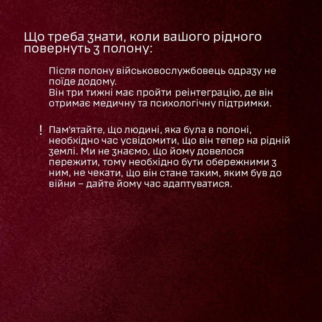 ! Пам’ятайте, що людині, яка була в полоні, необхідно час усвідомити, що він тепер на рідній землі. Ми не знаємо, що йому довелося пережити, тому необхідно бути обережними з ним, не чекати, що він стане таким, яким був до війни – дайте йому час адаптуватися.