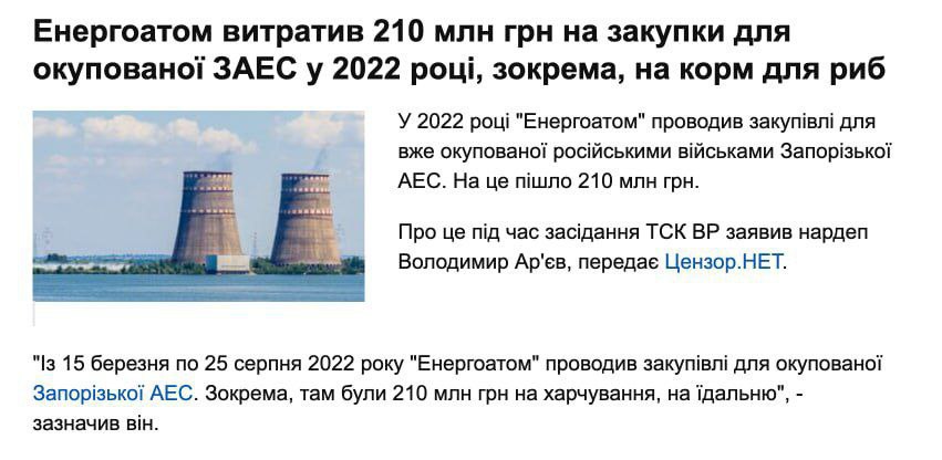 Також, за словами Ар’єва, кошти витрачалися на корм для риб Запорізької АЕС (вочевидь, йдеться про риб у ставках-охолоджувачах станції).