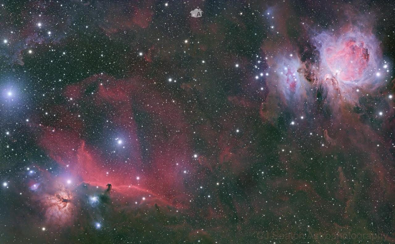 Перлини Оріона: у лівому нижньому куті — «Полум’я» та «Кінська Голова», у правому верхньому — «Людина, що біжить» та Туманність Оріона. Christopher Seaton