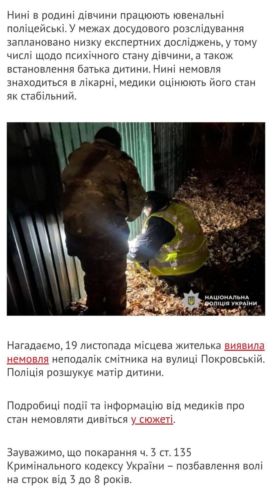 - Немовля знайдено ввечері 19 листопада: місцева жителька помітила його неподалік смітників і викликала поліцію.