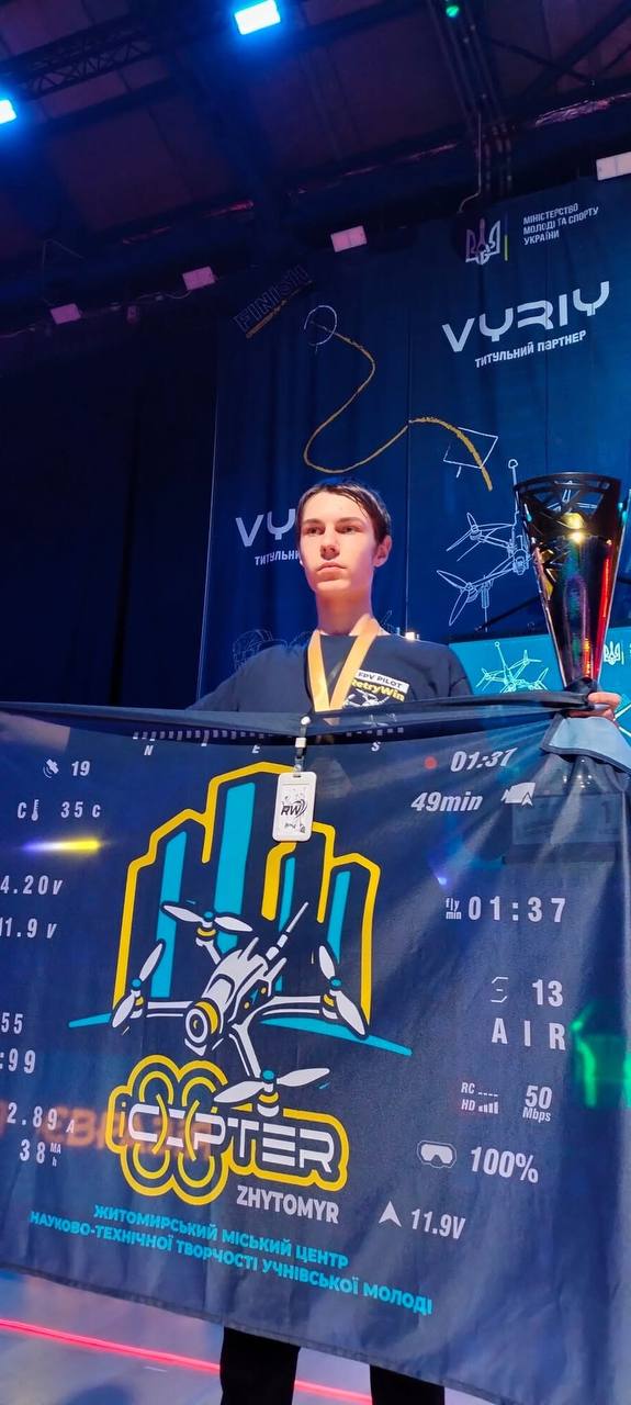 Юний пілот продемонстрував надзвичайно високий рівень технічної підготовки та точності, виборовши перемогу серед 30 найсильніших спортсменів з усієї країни та заслужено отримавши звання найкращого пілота України у своїй віковій категорії на FPV-дронах.