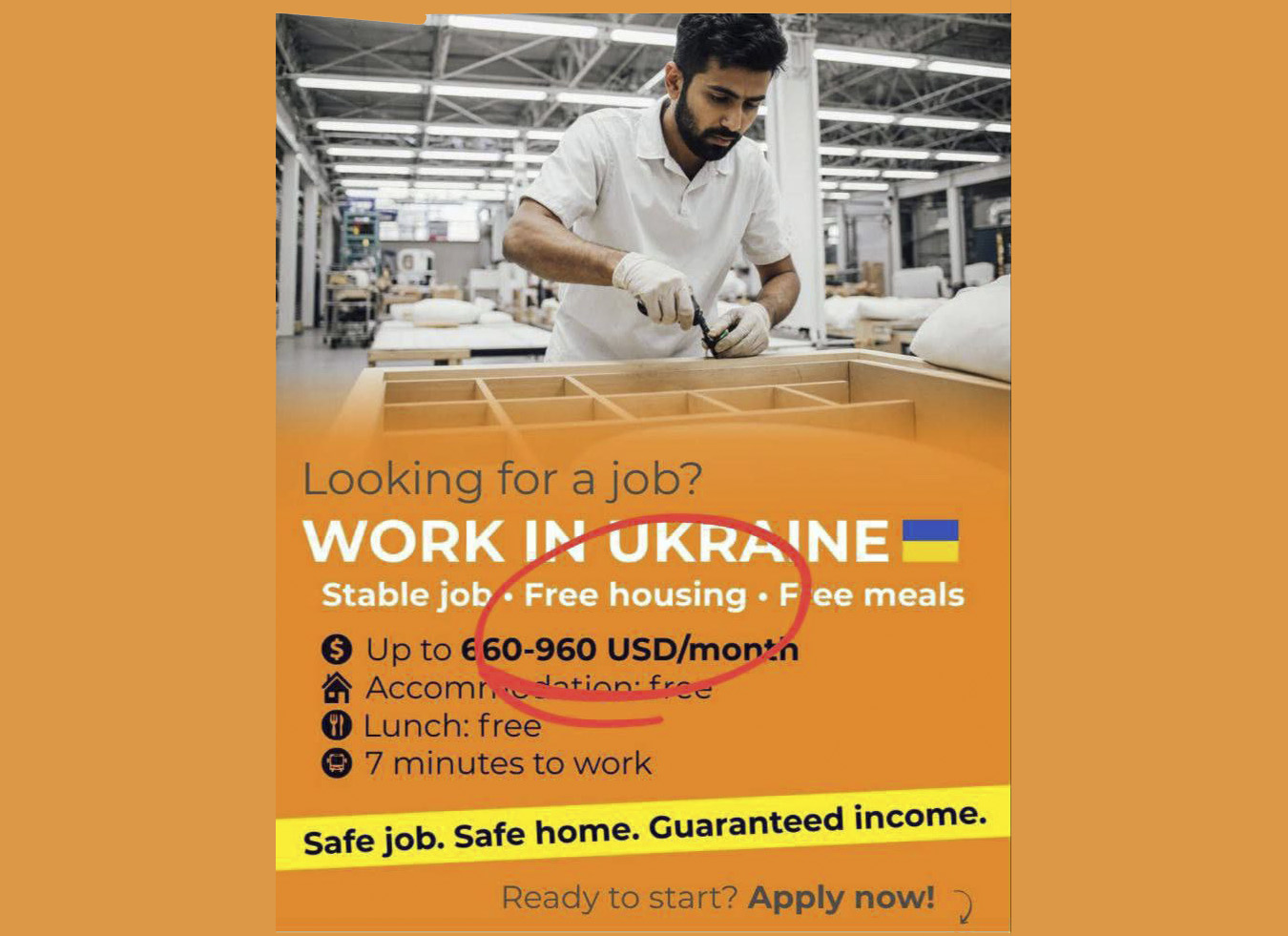 «Мігрантам пропонують $660–$960 на місяць за роботу  Україні, а також безкоштовне житло і хавку, — мережа. Також їм не загрожують заходи оповіщення, через це зростає їх привабливість на ринку праці».