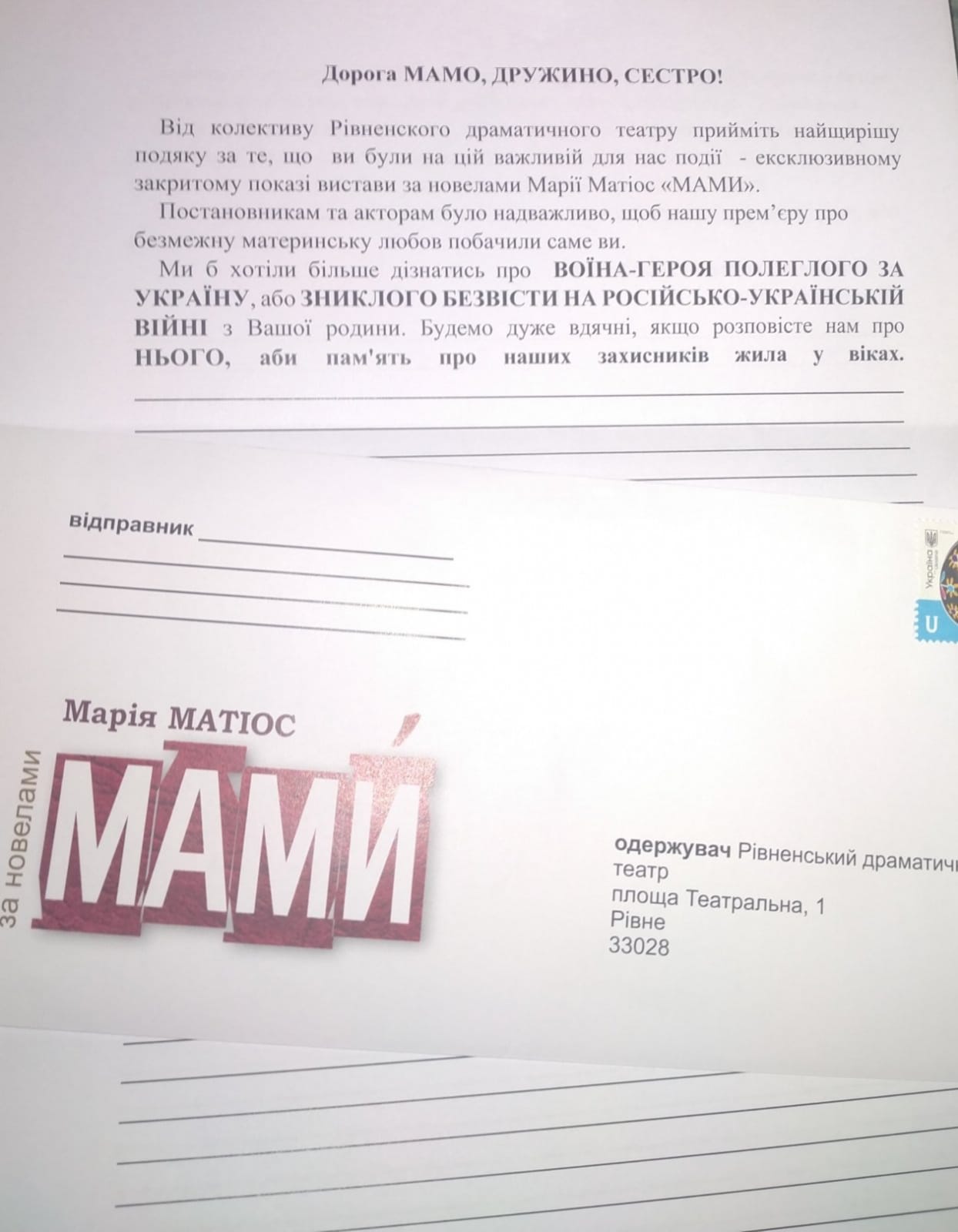 Дуже важливою частиною події стало вручення кожній матері чистих аркушів та конвертів для листів до авторів п’єси. Цей задум має на меті набагато більше, ніж просто емоційну підтримку. Творці вистави планують зібрати в таких листах історії про втрачених синів та доньок зі всієї України, так, як їх знають та пам’ятають саме матері. На основі цих оповідей з перших вуст буде реалізовано унікальний проєкт «Книга Пам’яті наших Героїв». Це гарантія того, що сміх, мрії, плани та найбільша жертва наших Захисників і Захисниць не будуть забуті, стануть частиною ДНК нації та фундаментом нашої свободи.