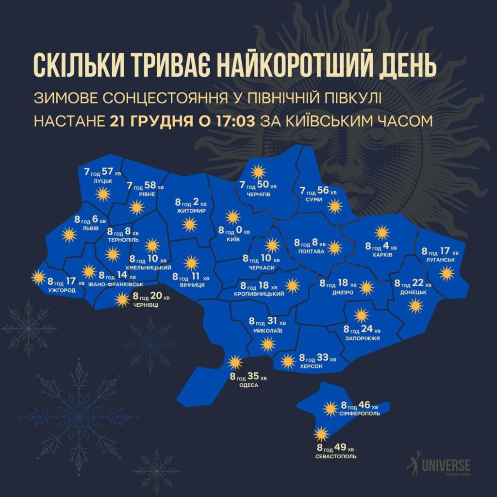 Астрономи можуть доволі точно обчислити цей момент: у 2025 році він настає 21 грудня о 17:04 (15:04 UTC). У цей день світлова частина доби є найкоротшою, а темна — найдовшою. Наприклад, у Києві між сходом і заходом Сонця лише 8 годин 13 секунд — приблизно удвічі менше, ніж у день літнього сонцестояння.