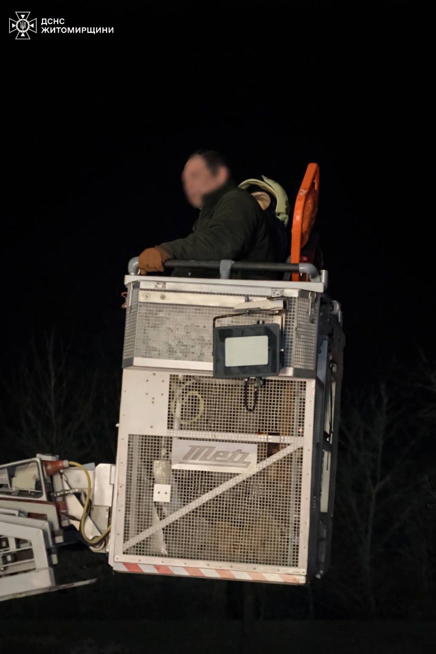 Фахівці ДСНС спустилися до нього та обв’язали його рятувальною мотузкою. Спеціальним інструментом вони розрізали шнек, завдяки чому змогли звільнити чоловіка й витягнути назовні. Далі рятувальники зняли його з висоти близько 10 м, використовуючи автодрабину, та передали його медикам.