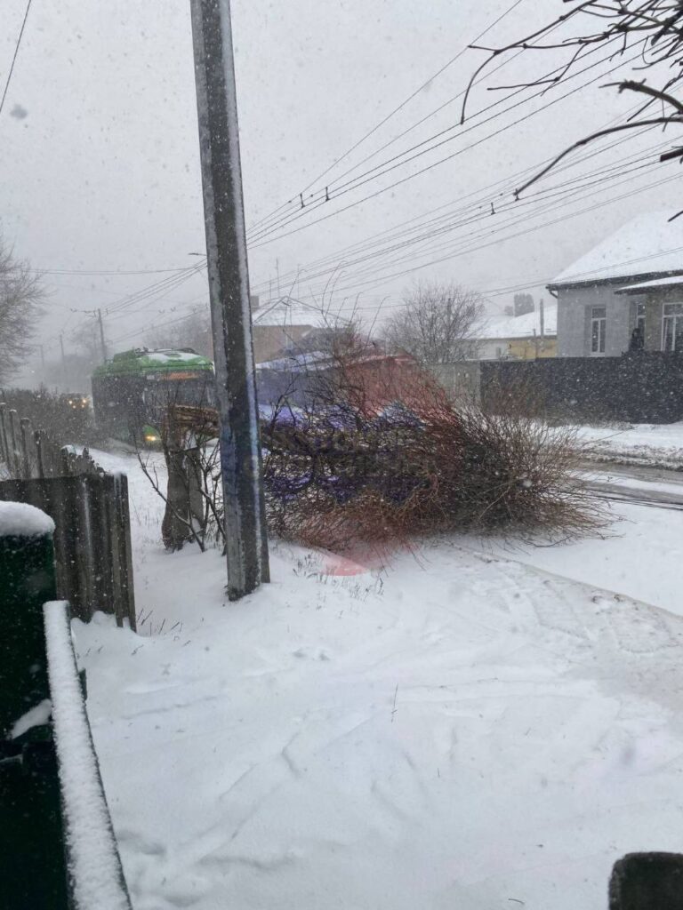 Через сильний вітер вона впала на проїжджу частину. Тролейбуси зупинилися, рух транспорту ускладнений.