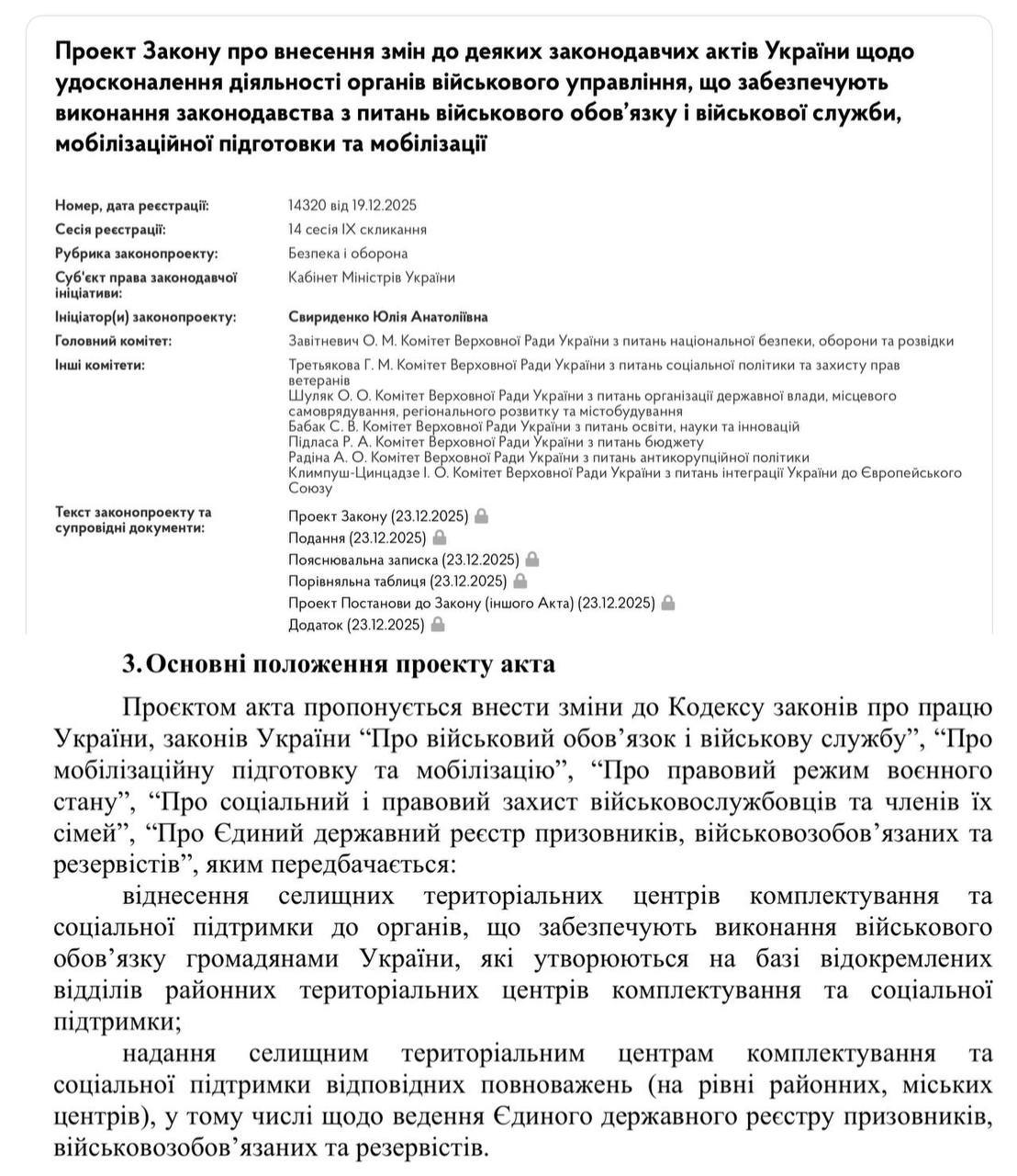 У Верховній Раді України зареєстровано новий законопроєкт № 14320, який передбачає суттєві зміни у системі територіальних центрів комплектування та соціальної підтримки (ТЦК). Документ розроблений Кабінетом Міністрів і має на меті розширення мережі ТЦК на сільські населені пункти та наділення їх повноцінними управлінськими повноваженнями, аналогічними тим, що нині виконують районні та міські ТЦК.