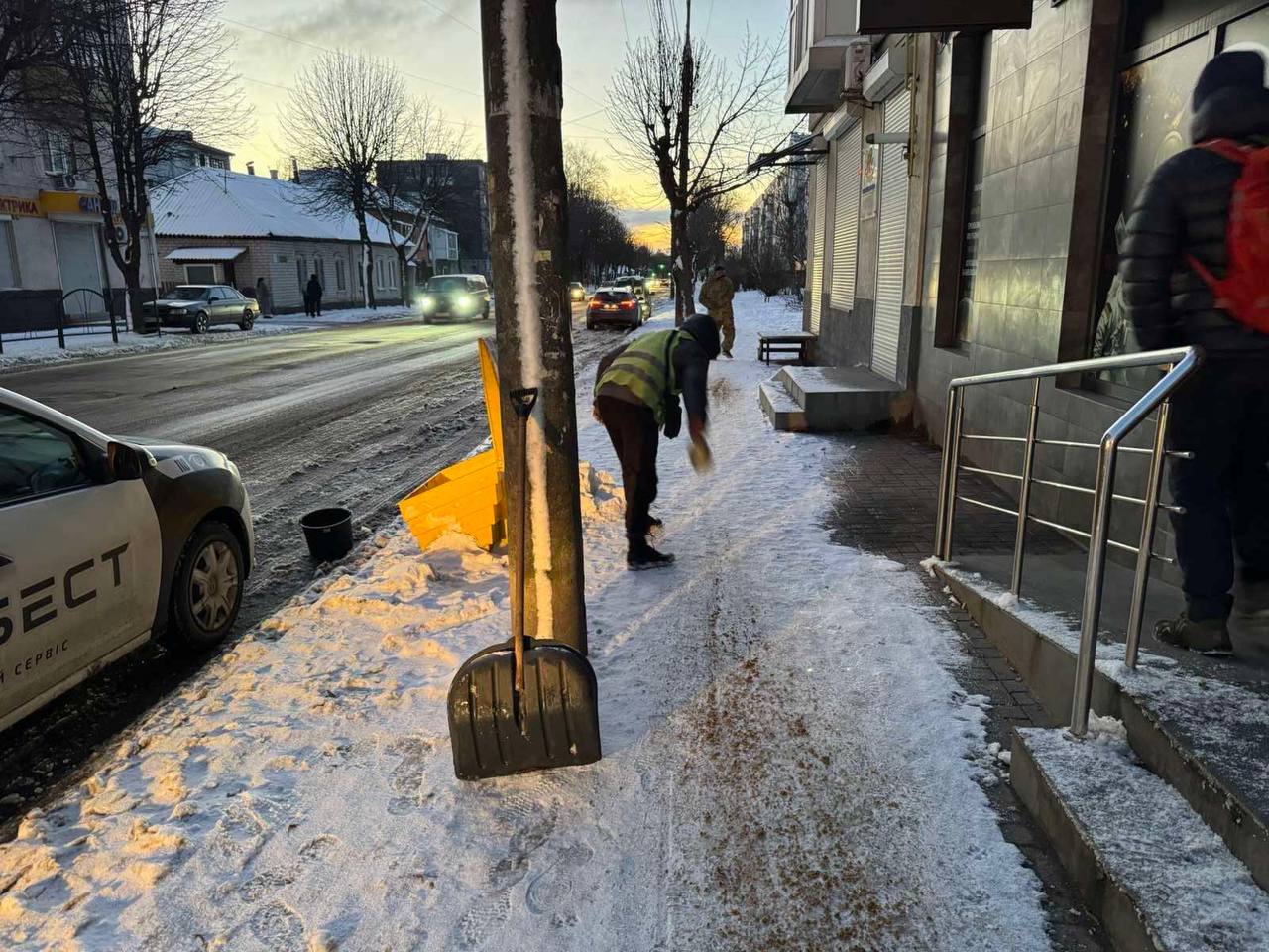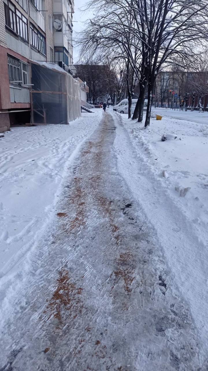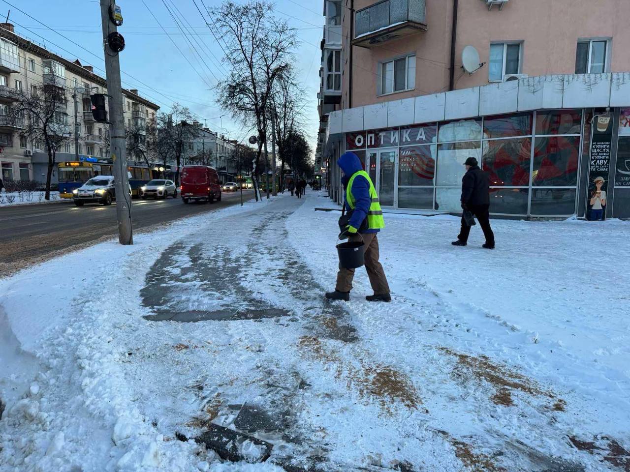 Також залучені працівники у складі бригад із ручного прибирання. Вони очищають та обробляють протиожеледними засобами зупинки громадського транспорту, вузькі тротуари, сходи, острівці безпеки та пішохідні переходи.
