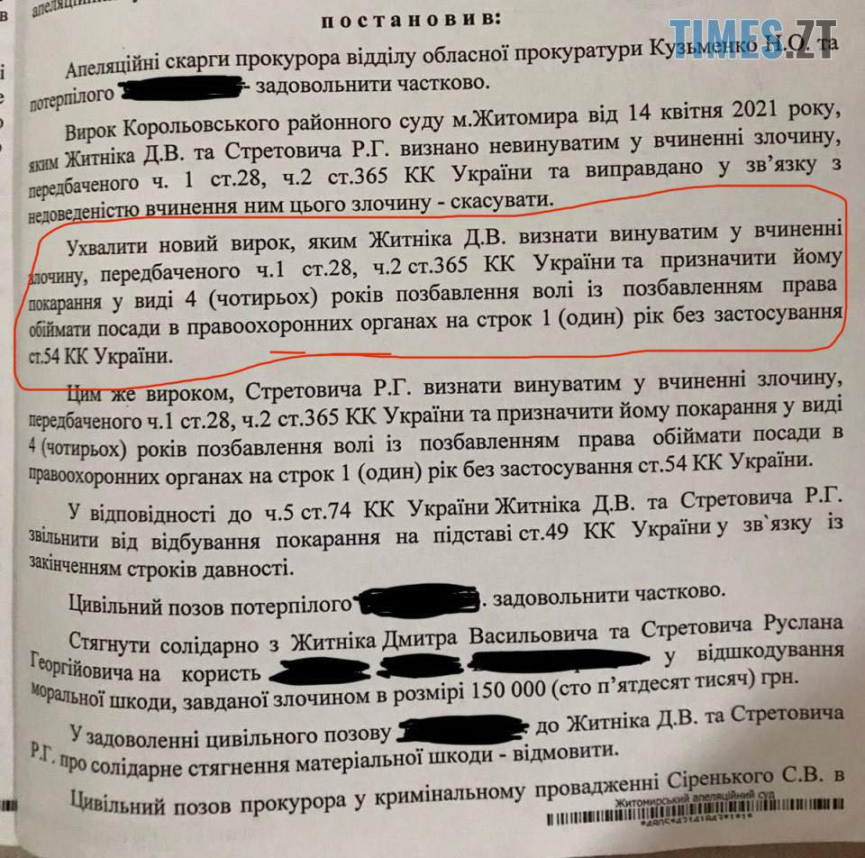 Апеляційний суд визнав Дмитра Житніка винуватим у вчиненні злочину за ч.2 ст.365 КК України — перевищення влади, призначив 4 роки позбавлення волі та заборону працювати в правоохоронних органах.
