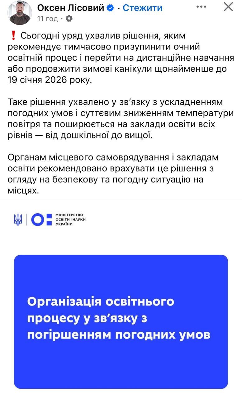 Рекомендовано забезпечити перехід на дистанційну форму навчання або продовжити зимові канікули щонайменше до 19 січня 2026 року.