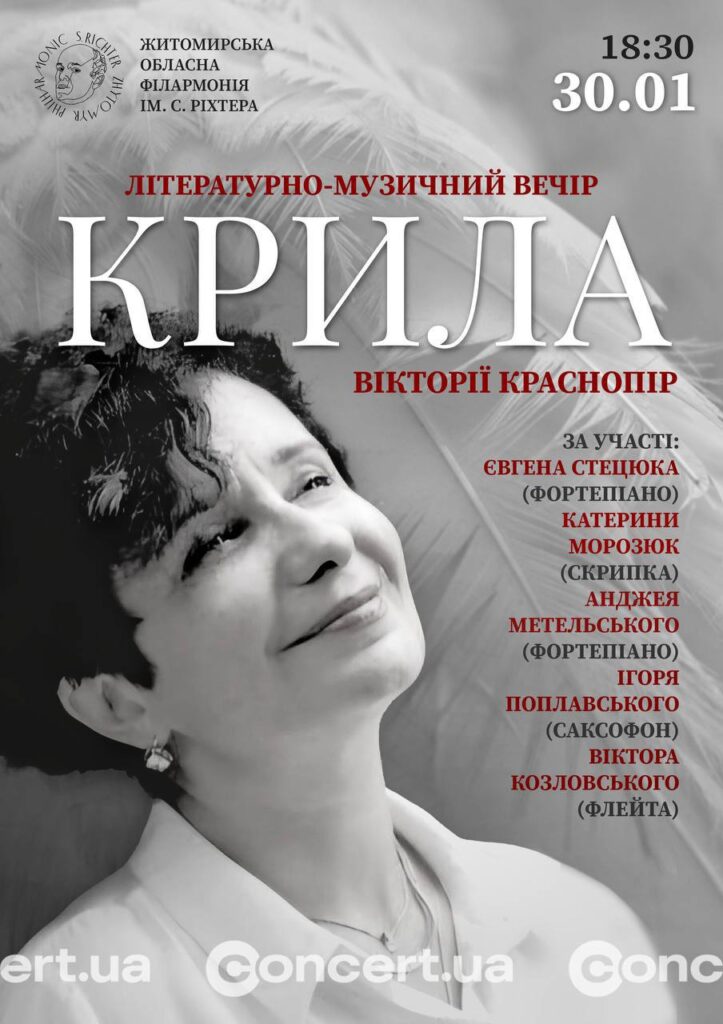Житомирська обласна філармонія ім. С. Ріхтера запрошує на літературно-музичний вечір «Крила» — камерну подію, де поезія звучить, а музика промовляє мовою почуттів.