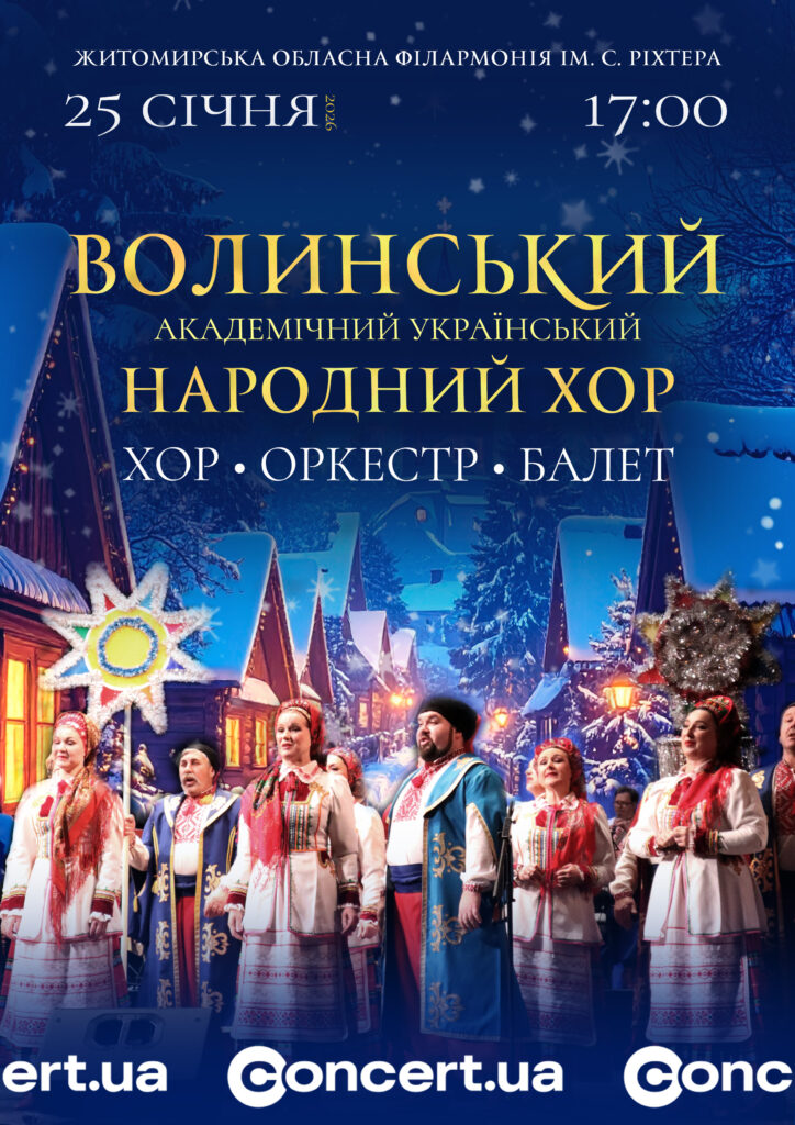 Житомирська обласна філармонія ім. С. Ріхтера запрошує 25 січня 2026 року о 17:00 на різдвяний концерт Волинського академічного народного хору.