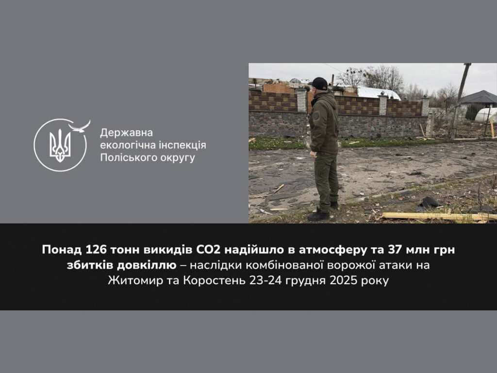 Державна екологічна інспекція Поліського округу здійснила розрахунки розміру шкоди, завданої неорганізованими викидами забруднюючих речовин в атмосферне повітря та збитків, заподіяних засміченням земель відходами руйнації внаслідок російського обстрілу міст Житомир та Коростень 23 та 24 грудня 2025 року.