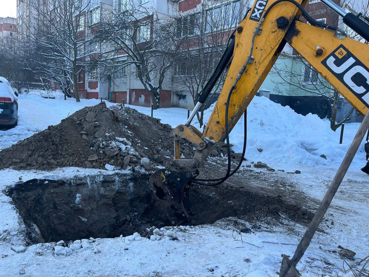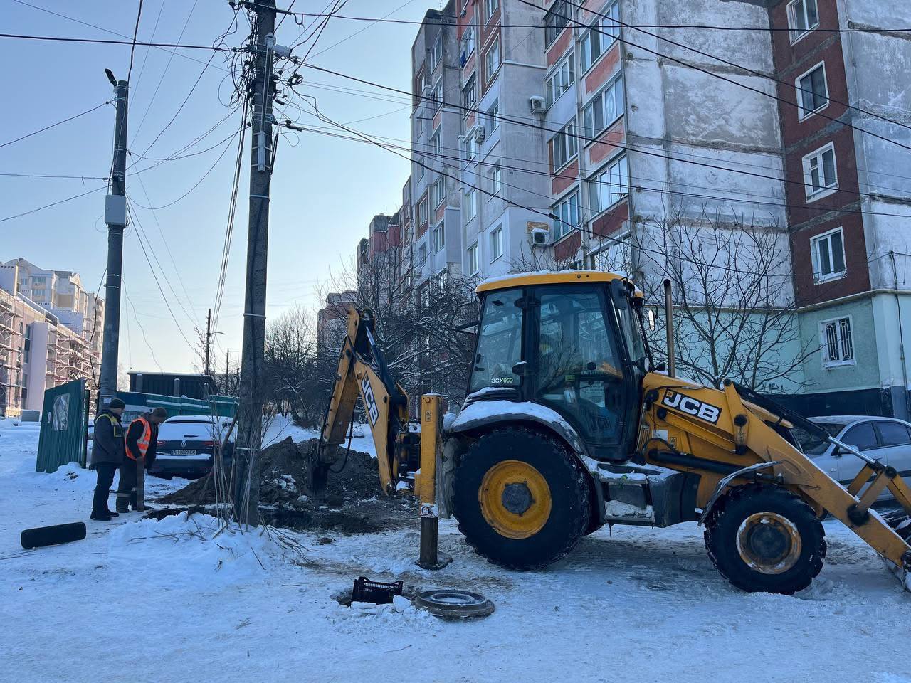 Попри мінусові температури, сьогодні бригади водоканалу виконують аварійно-відновлювальні роботи на вулиці Захисників України.