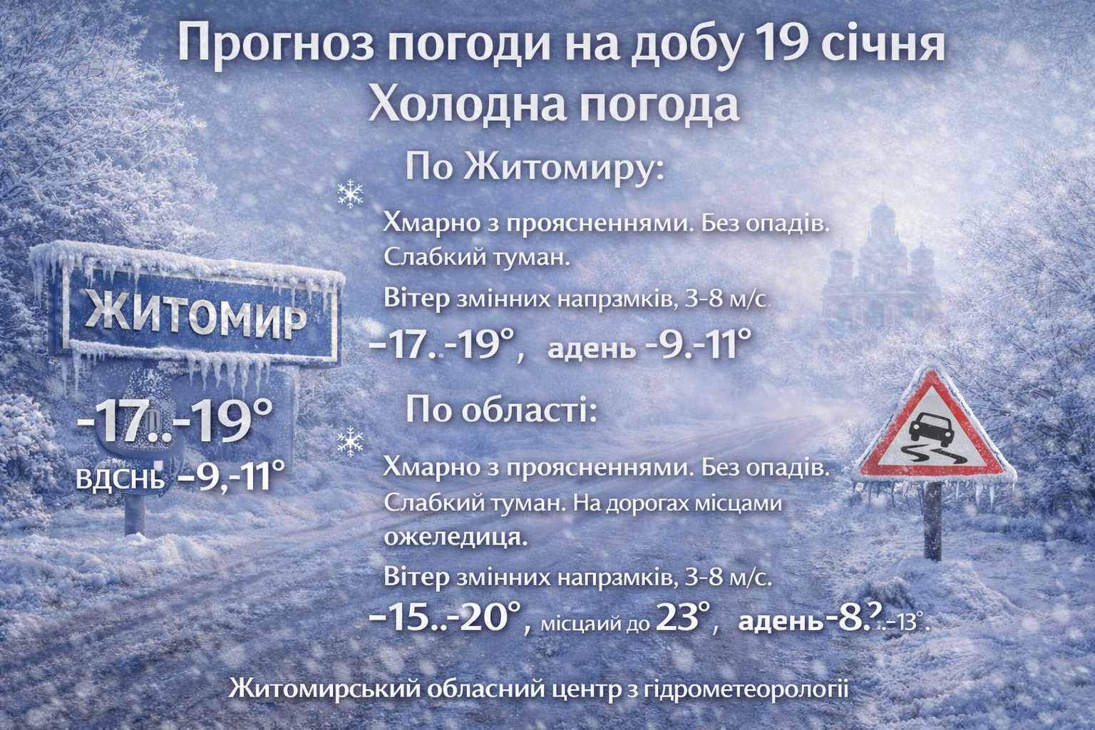 По області: Хмарно з проясненнями. Без опадів. Слабкий туман. На дорогах місцями ожеледиця.