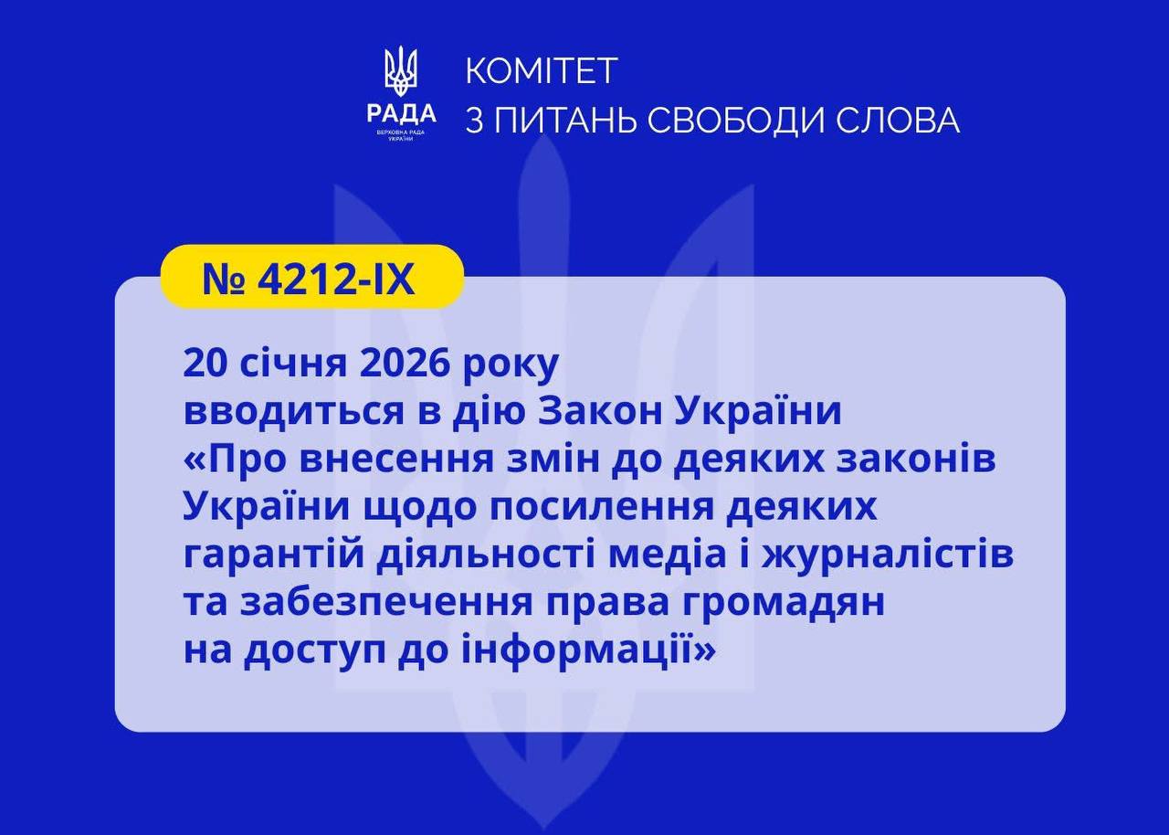 Відкритість влади — не опція, а норма. Сьогодні, 20 січня 2026 року, вводиться в дію Закон України «Про внесення змін до деяких законів України щодо посилення деяких гарантій діяльності медіа і журналістів та забезпечення права громадян на доступ до інформації» (№ 4212-IX).
