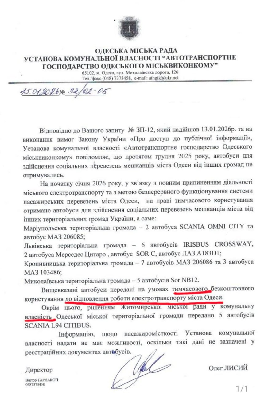 В умовах проблем з енергопостачанням та роботою комунального електротранспорту в Одесі, низка міст надали свою допомогу, передавши автобуси для забезпечення руху. При цьому, всі міста зробили це на умовах тимчасового користування. І лише Житомир віддав свою техніку у власність.