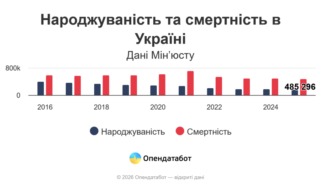 Більш ніж 168,7 тисячі дітей народилось в Україні у 2025 році за даними Міністерства юстиції України. Водночас зафіксовано 485,2 тисячі смертей. Загалом на одного новонародженого торік припадало троє померлих. За рік смертність в Україні скоротилась на 2%, а народжуваність — на 4,5%.