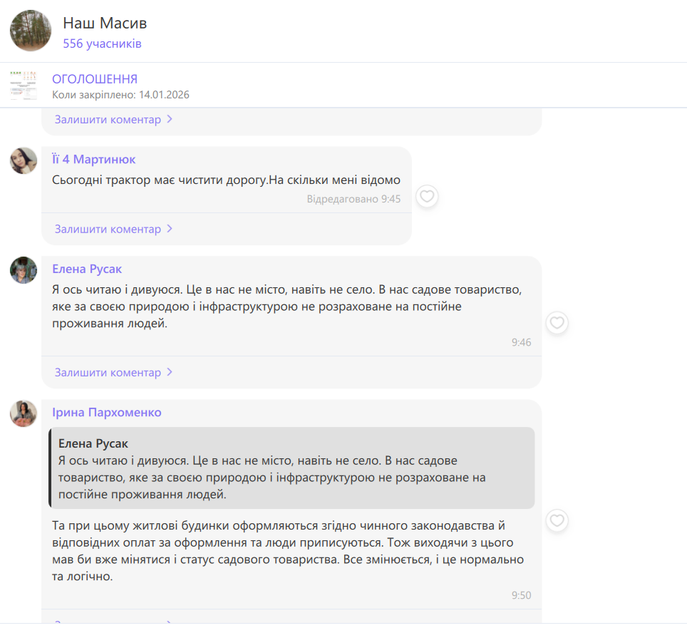 “Знаю, що відповіді не дочекаємося від Вас, але ж все-таки є надія, що Ви хоть щось нам повідомите”, — із відчаєм пише Марина у чаті громади.