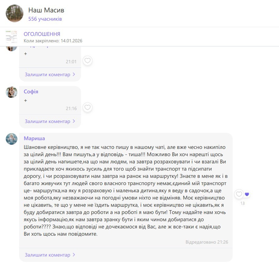 Особливе обурення викликає повна відсутність реакції з боку керівництва “РСТ Давидівський” на кризову ситуацію. Мешканці масштабно обговорюють проблему у чаті, шукають хоч якусь інформацію про плани відновлення транспортного сполучення, але не отримують жодних офіційних коментарів чи пояснень.