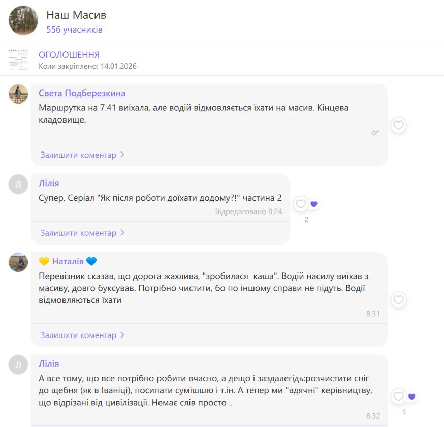 За інформацією з чату мешканців, у ніч на 28 січня дорогу намагалися посипати, однак це не вплинуло на рішення перевізника. “Перевізник сказав, що дорога жахлива, ‘зробилася каша’. Водій насилу виїхав з масиву, довго буксував. Потрібно чистити, бо по іншому справі не підуть. Водії відмовляються їхати”, — повідомила мешканка Наталія.