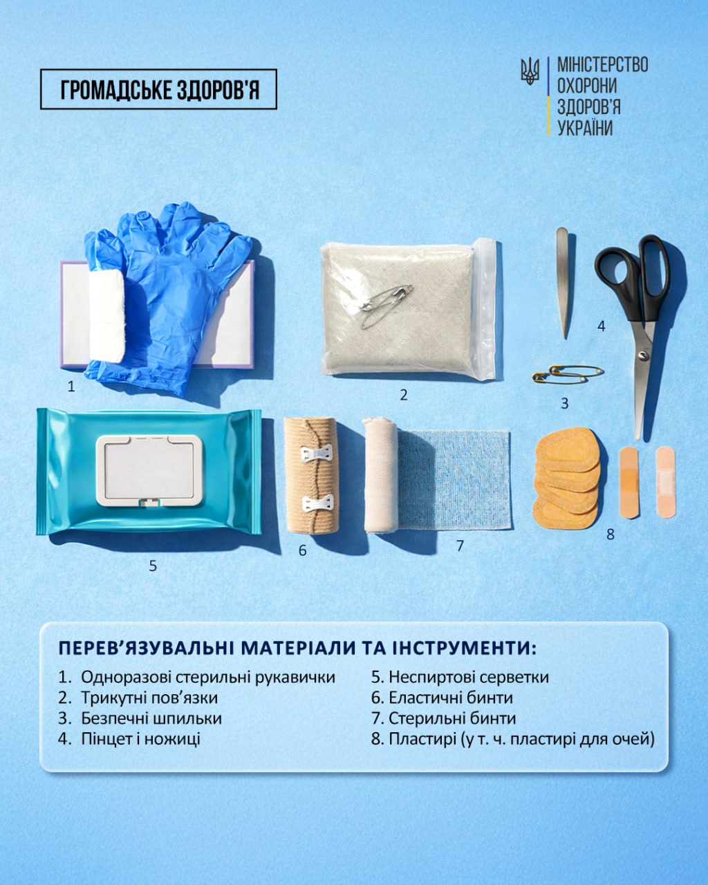 Окрім базового набору, про який йдеться на картинках, в умовах воєнного стану до аптечки доцільно додати якісний турнікет для зупинки кровотеч і заздалегідь навчитися ним користуватися.