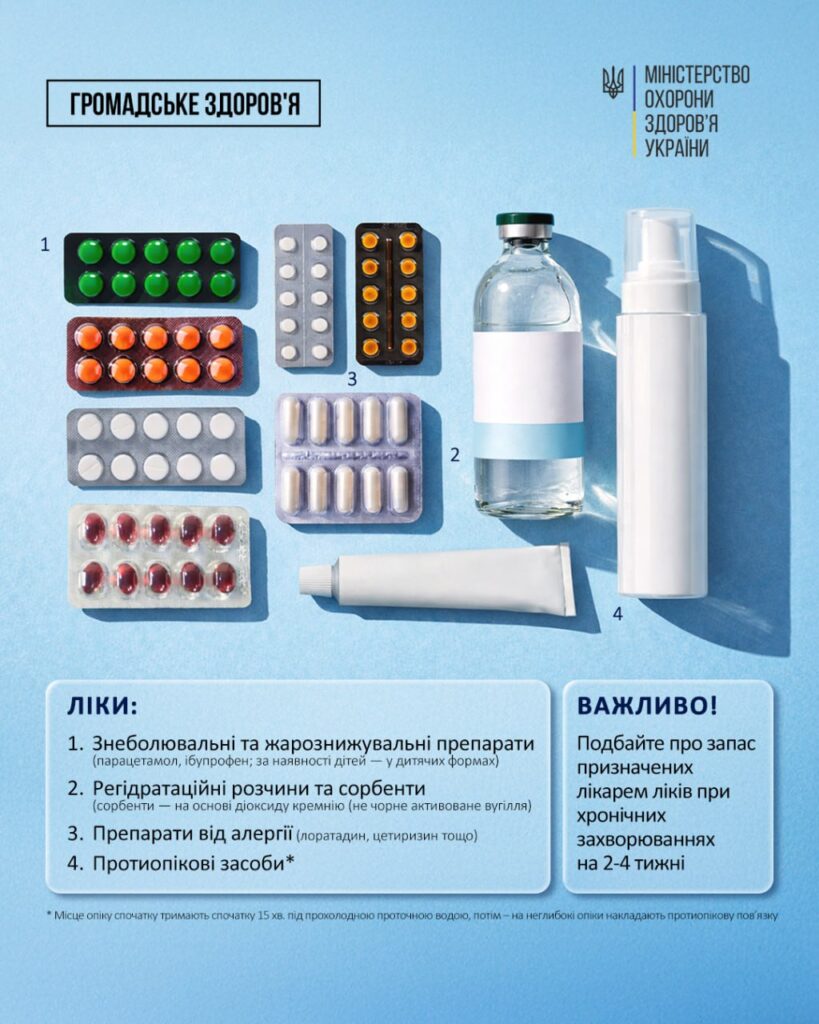 Формуючи домашню аптечку, зважайте на власний стан здоров’я та потреби родини. Якщо хтось із близьких має хронічні захворювання, обов’язково додайте до аптечки препарати, які приймаєте регулярно (рецептурні або безрецептурні). Варто мати щонайменше двотижневий, а краще — місячний запас таких ліків