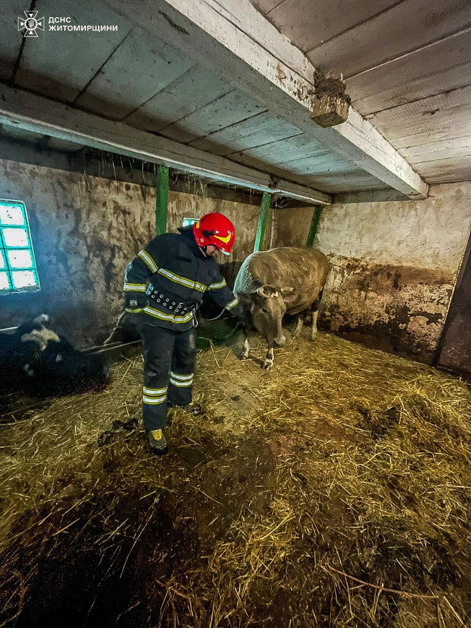 Вчора вдень до рятувальників надійшло повідомлення, що необхідно дістати корову, яка провалилась у приватному домоволодінні в с. Краївщина Житомирського району. На місці події стало відомо, що тварина провалилась у господарчій споруді, через те, що її не витримала підлога.