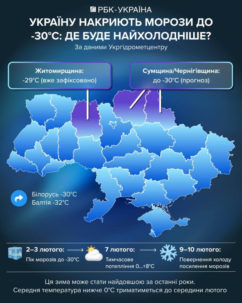 Сильні морози повернуться в Україну після потепління вже з 9 лютого: сьогоднішня ніч буде найхолоднішою — до -30,°C, – РБК-Україна