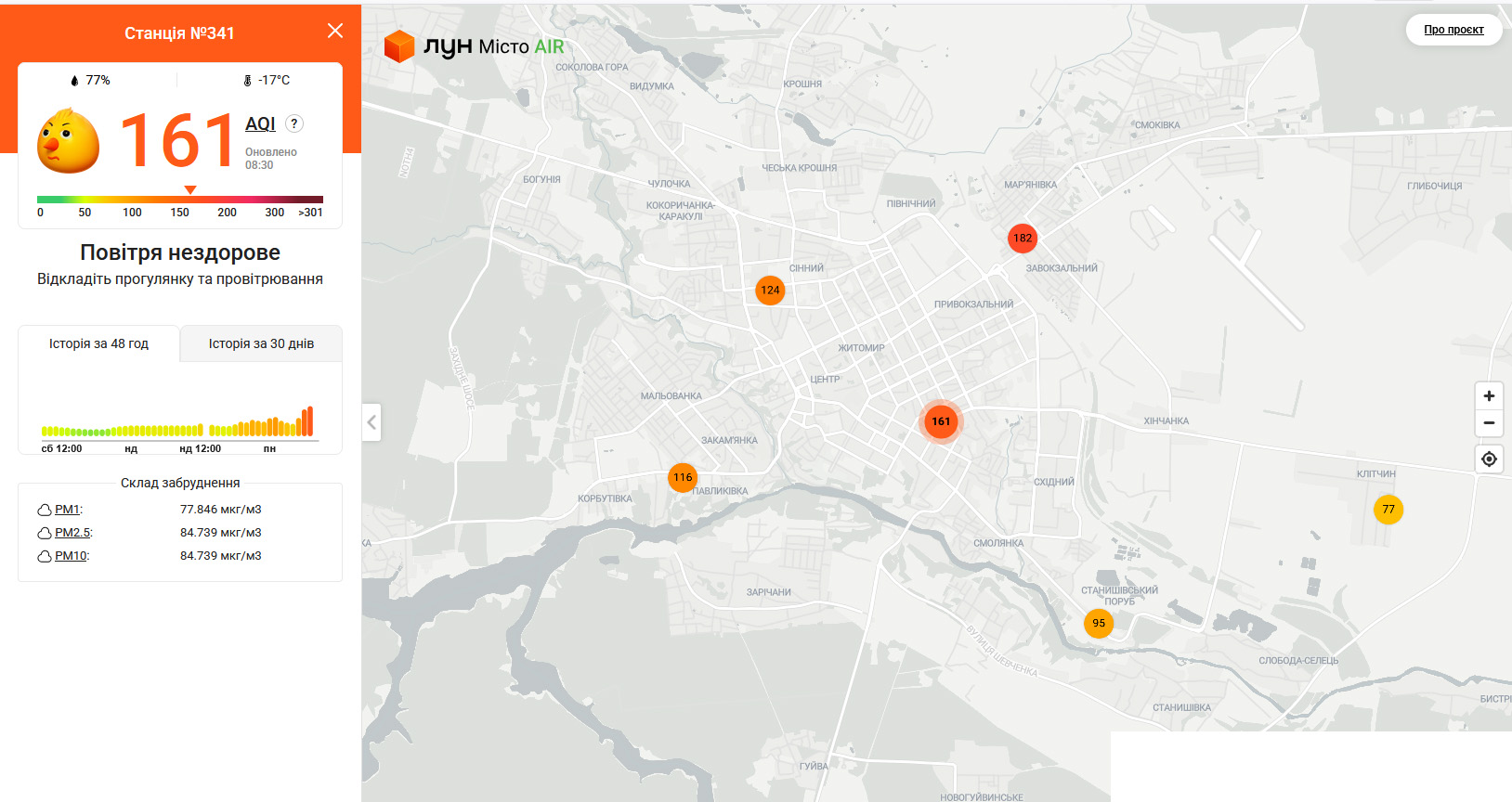 - Путятинська площа: близько 161 AQI — повітря шкідливе для більшості населення.