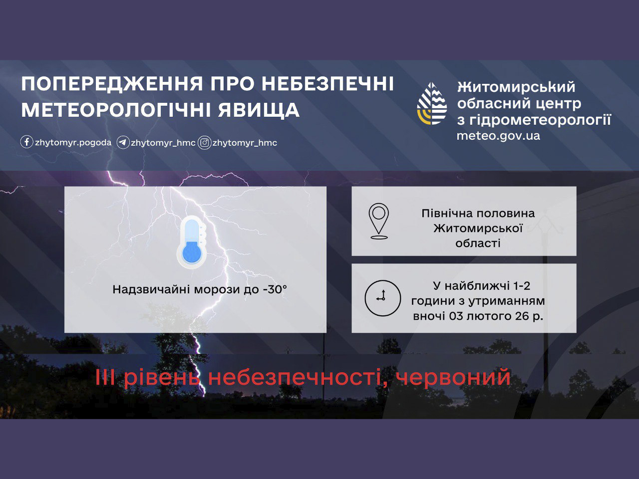 Поширити Facebook Twitter LinkedIn Pinterest Email У найближчі 1-2 години з утриманням до кінця ночі 03 лютого у північній половині Житомирської області очікуються надзвичайні морози до -30° (ІІI рівень небезпечності – червоний). Житомирський обласний центр з гідрометеорології Коментувати See more ДСНС Житомир Небезпечні об'єкти погіршення погодних умов Природні явища Прогноз погоди Україна