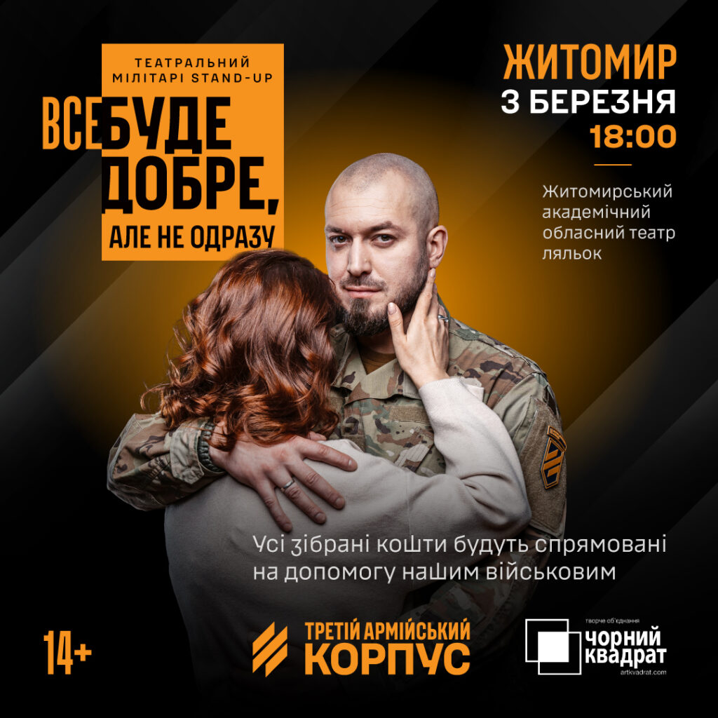 Запрошуємо на документальну виставу «Все буде добре, але не одразу» від Третього армійського корпусу, яка відбудеться 3 березня о 18.00 у Житомирському академічному обласному театрі ляльок.