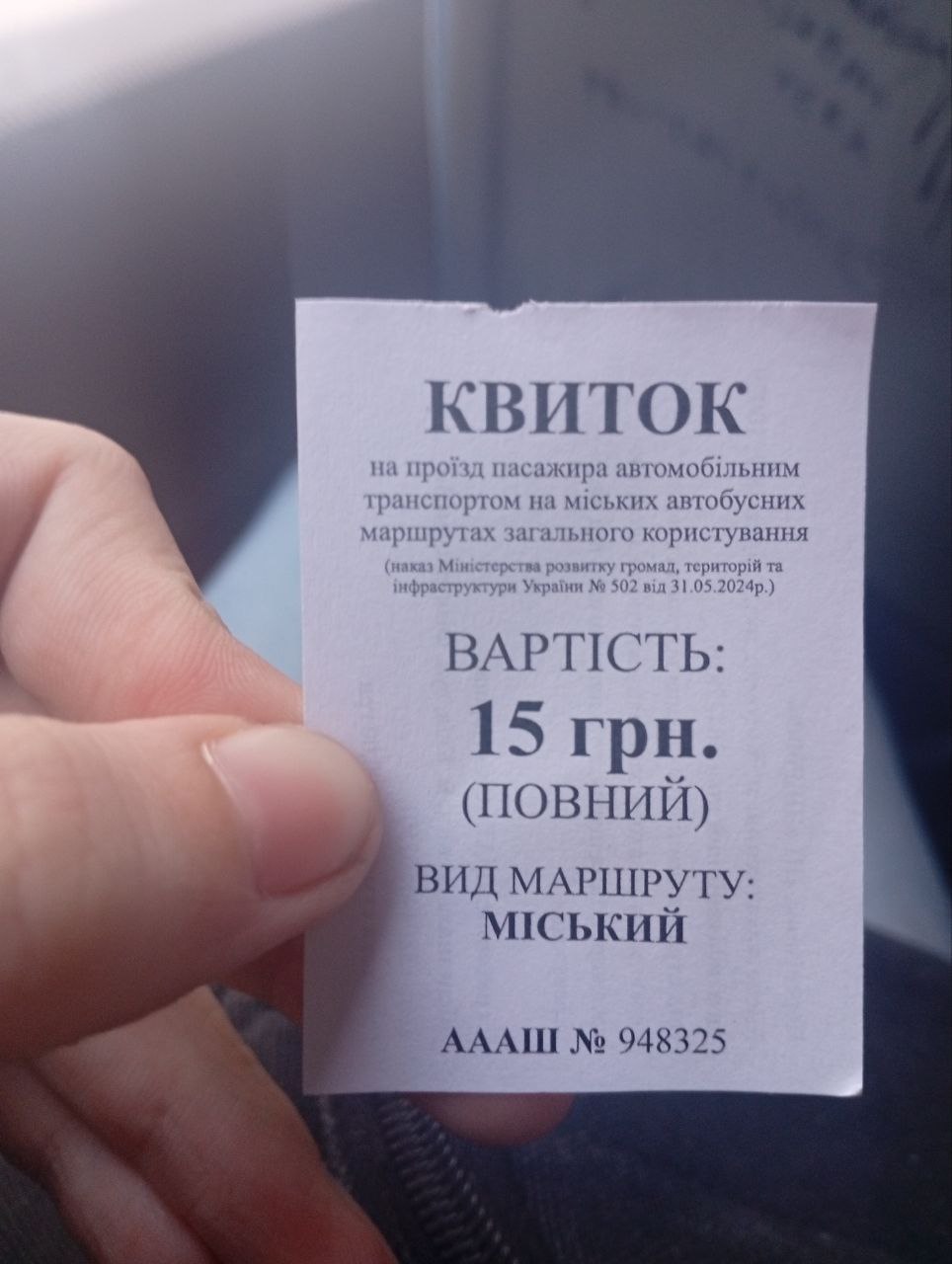 На квитку зафіксована вартість — 15 грн. Це пряме порушення чинних рішень Виконавчого комітету Житомирської міськради про встановлення вартості проїзду.