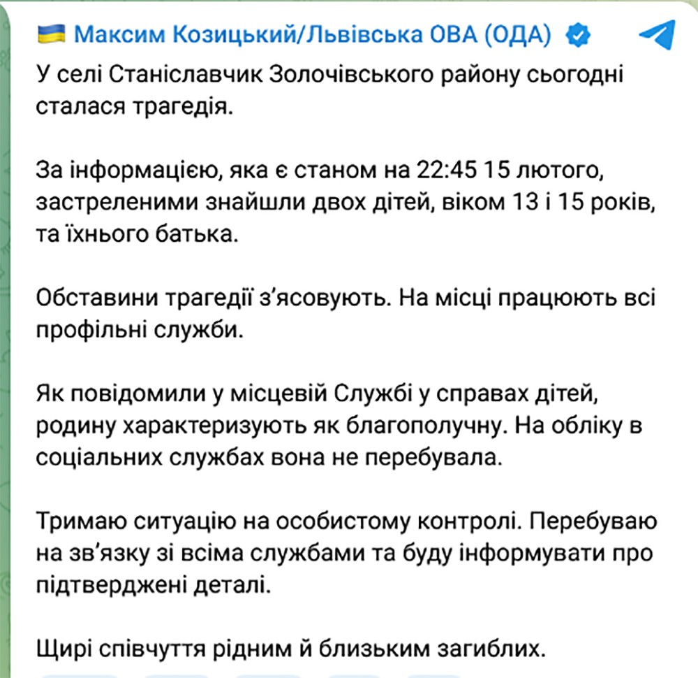 У Золочівському районі Львівської області у приватному будинку виявили тіла чоловіка та двох його неповнолітніх дітей із вогнепальними пораненнями.